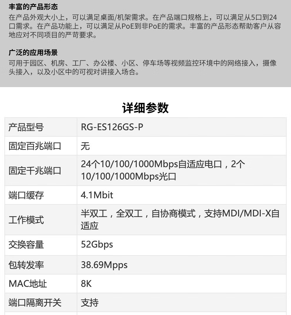 锐捷(Ruijie)RG-ES126GS-P24口千兆非网管POE供电企业级监控安防交换机黑色 自营