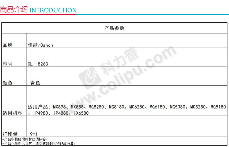 佳能Canon墨盒CLI-826C青色CLP墨盒 自营