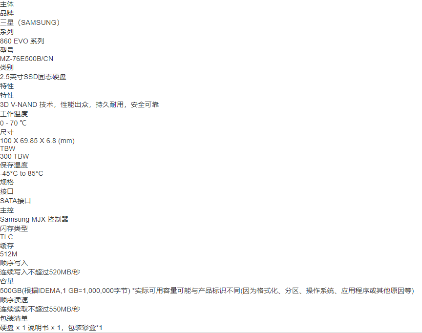 三星(SAMSUNG)500GBSSD固态硬盘SATA3.0接口860EVO(MZ-76E5 自营